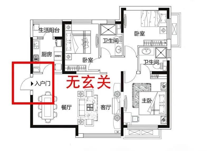 入戶無(wú)玄關(guān)?入戶正對(duì)客餐廳?入戶門(mén)還正對(duì)臥室/衛(wèi)生間?等等,如下圖: