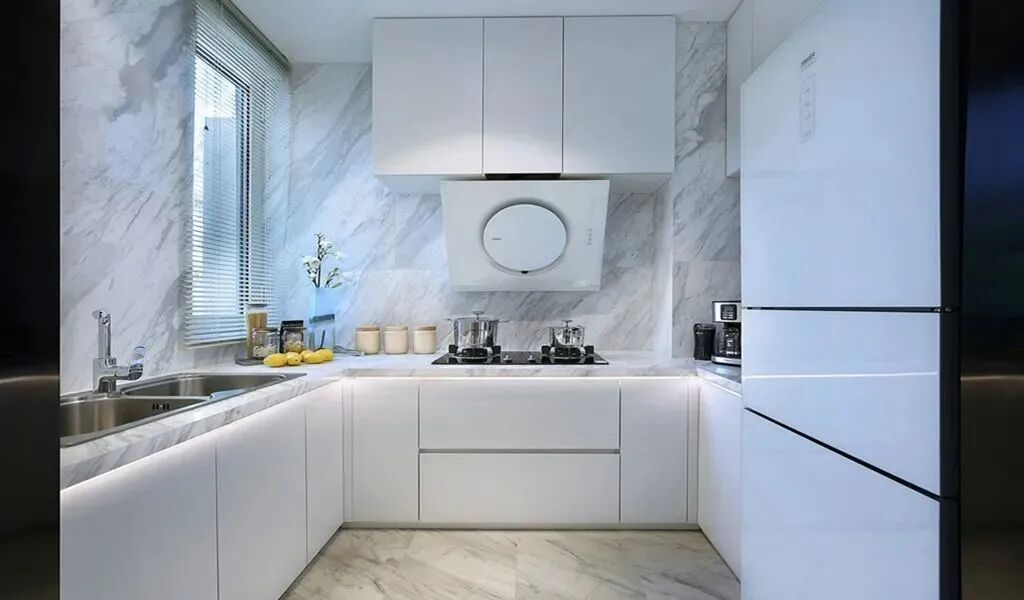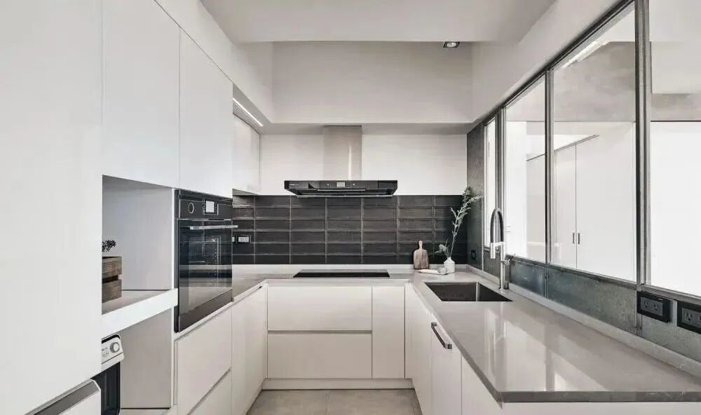 暗廚一般面積都很小,那么我們?cè)谏蚀钆涞臅r(shí)候就講到過(guò),像這樣的條件,我們可以選擇淺色系的配色,在視覺(jué)上讓廚房顯得更加的敞亮。
