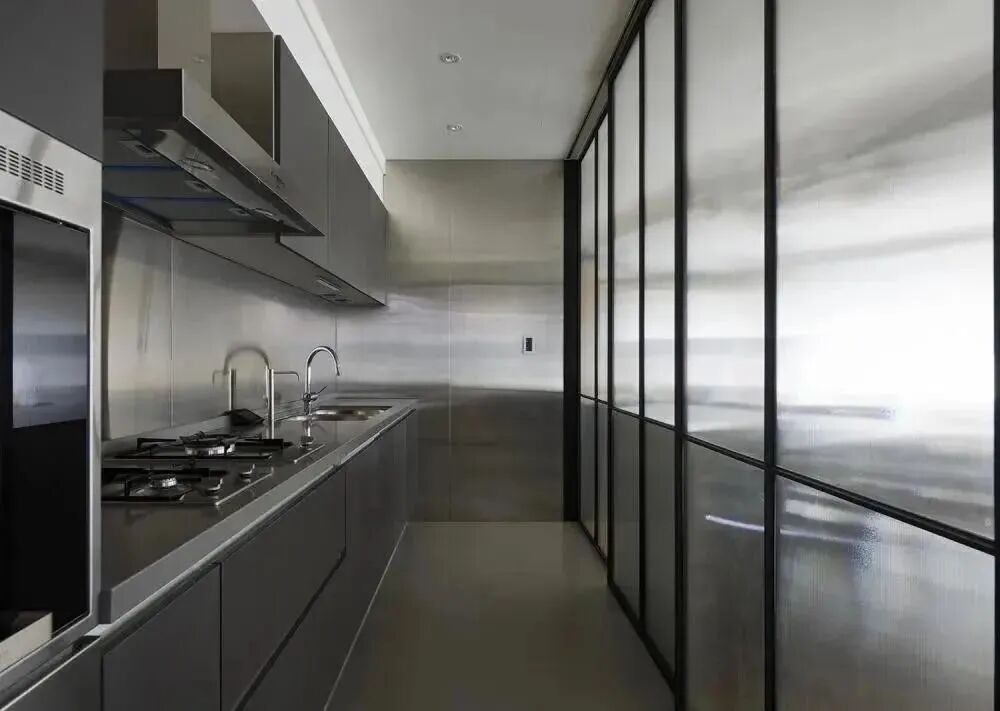 如果不想開(kāi)室內(nèi)窗,也不喜歡開(kāi)放式廚房,那就可以嘗試這個(gè)方法。(廚房門(mén)采用大面積玻璃門(mén))