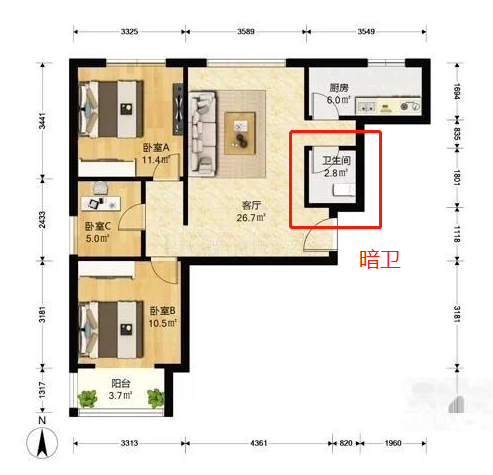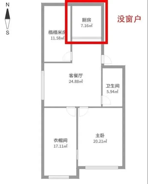 先來(lái)看看什么是暗廚?簡(jiǎn)單粗暴的講,就是沒(méi)有窗戶,一關(guān)燈就是烏漆墨黑的一片。戶型圖長(zhǎng)這樣↓