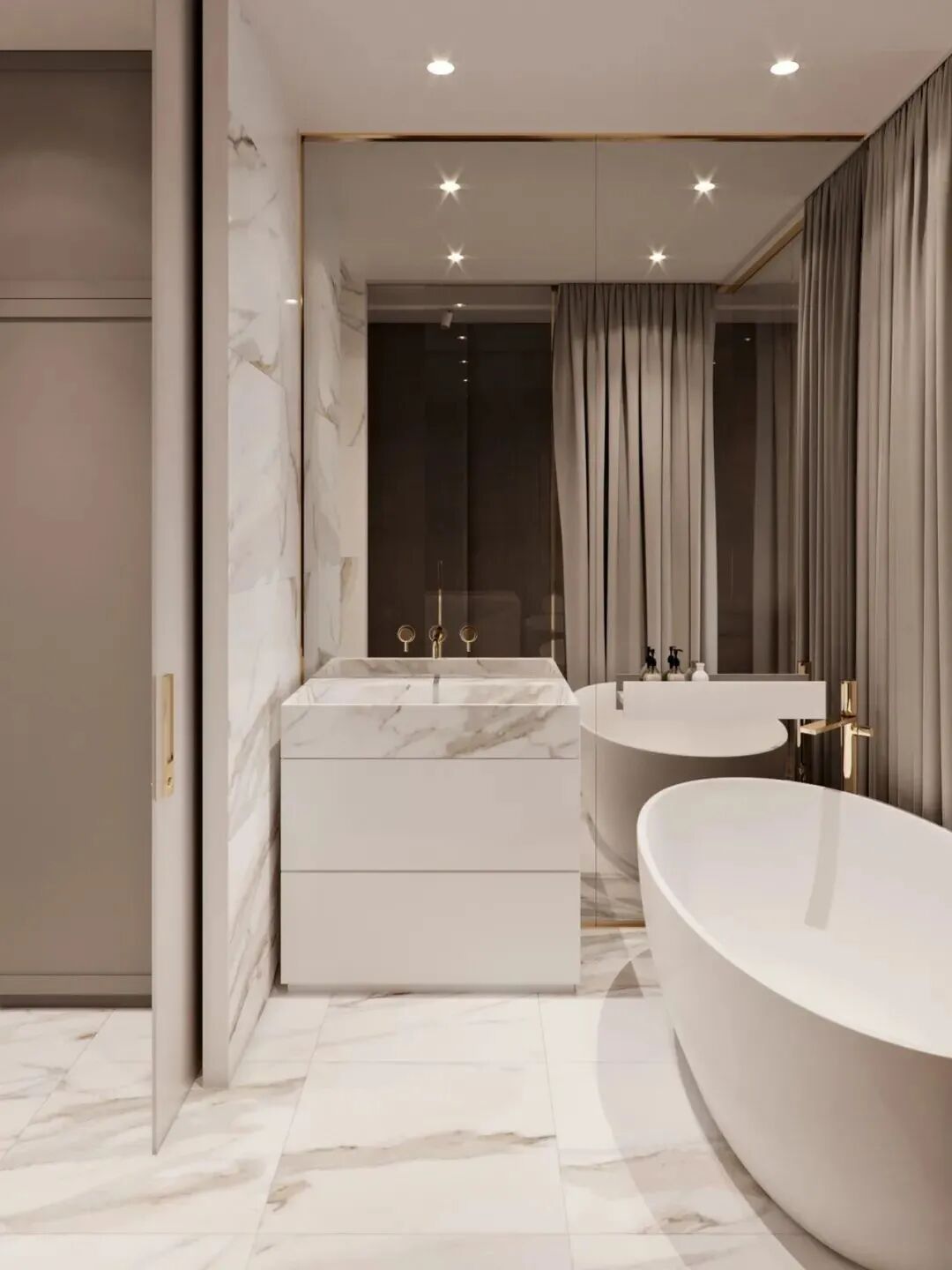 洗手臺(tái)外置:把洗手臺(tái)放置于衛(wèi)生間外面,已經(jīng)成為最普遍的選擇之一了,不僅如此,還妥妥地做到了“二式分離”衛(wèi)生間。