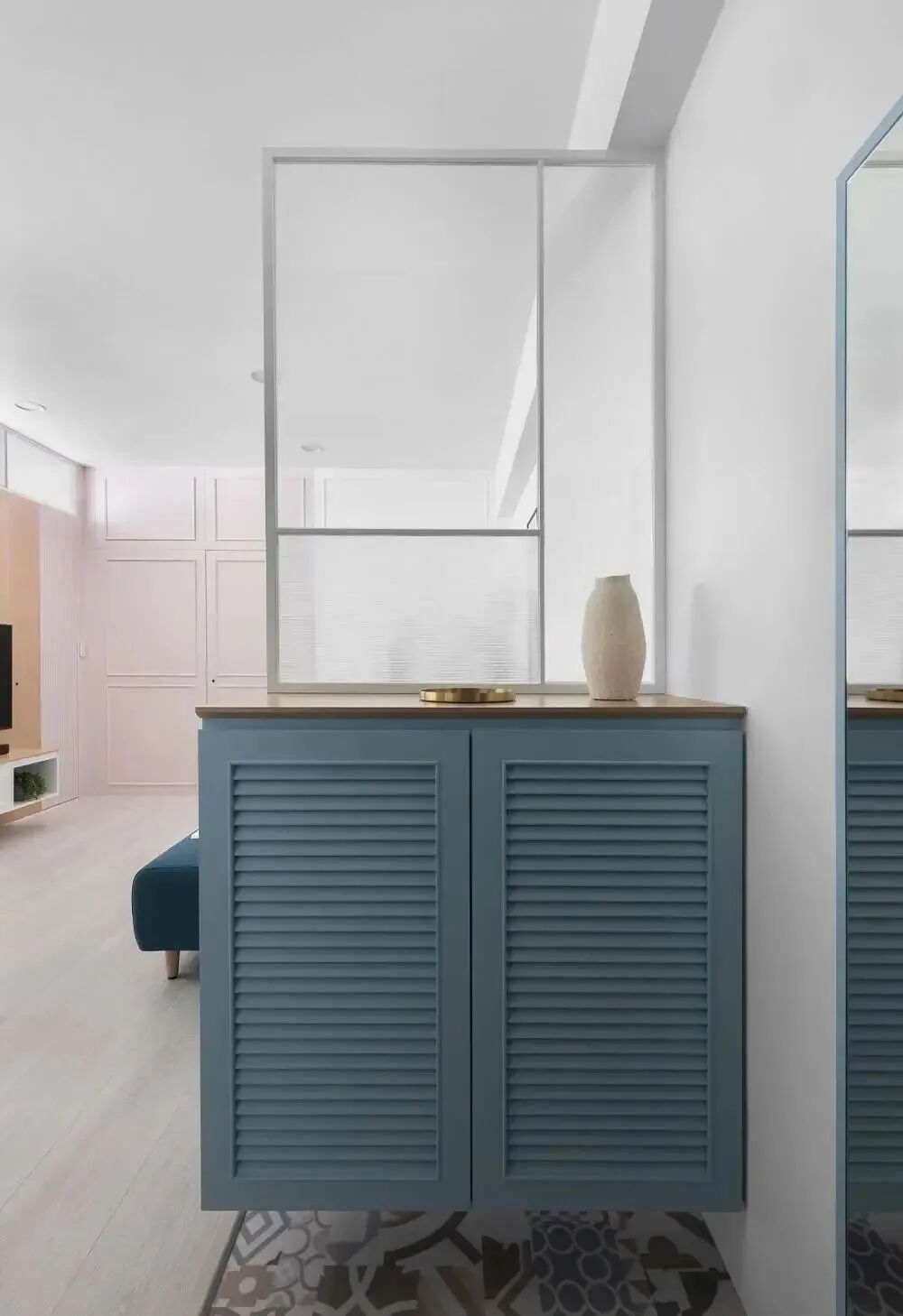 也可以結(jié)合鞋柜設(shè)計(jì),即起到了阻擋視線的作用,也增加了換鞋、收納的實(shí)用功能。
