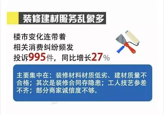 2017年裝修建材行業(yè)投訴增多,例如“材料參差不齊”“中途加價”、“逾期不交工”、“裝修質(zhì)量差”和“退費難”等問題非常突出。消費者選擇裝修公司一定要擦亮雙眼,選擇有資質(zhì)、年限久、有完善售后保障的裝修公司