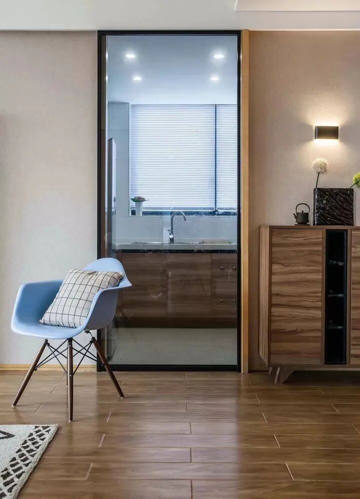 走廊跟客廳、臥室區(qū)域貼得一樣的地板,整個空間連貫性極強,走廊頂部的內嵌筒燈,按狹小的空間也搭配得效果也是希望的自然大方;
