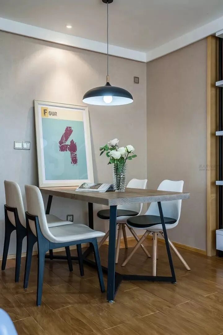 簡單簡潔的餐廳,鐵架木板的餐桌,搭配一套精致極簡的餐椅,顯得簡約而又自然舒適;