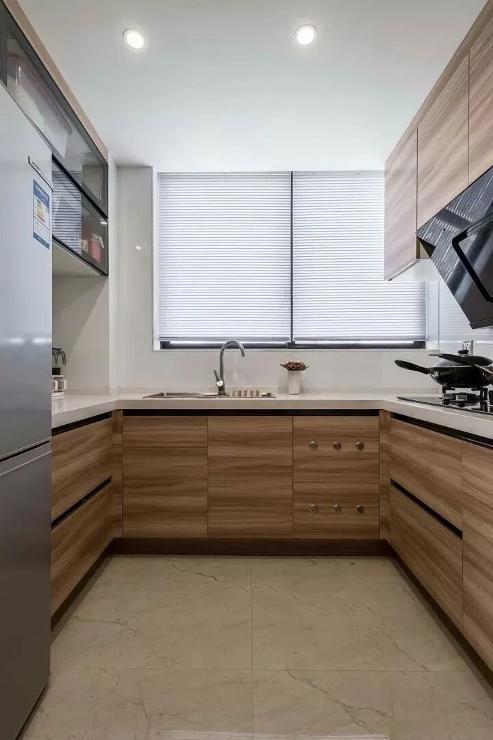 廚房以U型的布局,原木的櫥柜+百葉簾,結合寬松實用的空間格局,整體顯得格外的自然大方;