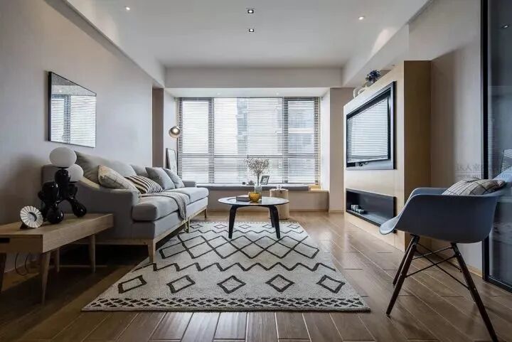 客廳是個沒陽臺的的格局,靠窗位置裝成飄窗+百葉簾的搭配,木地板+一塊小地毯,整個空間顯得明亮而又情調大方;