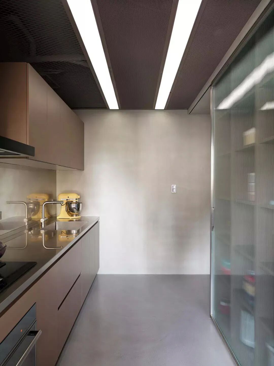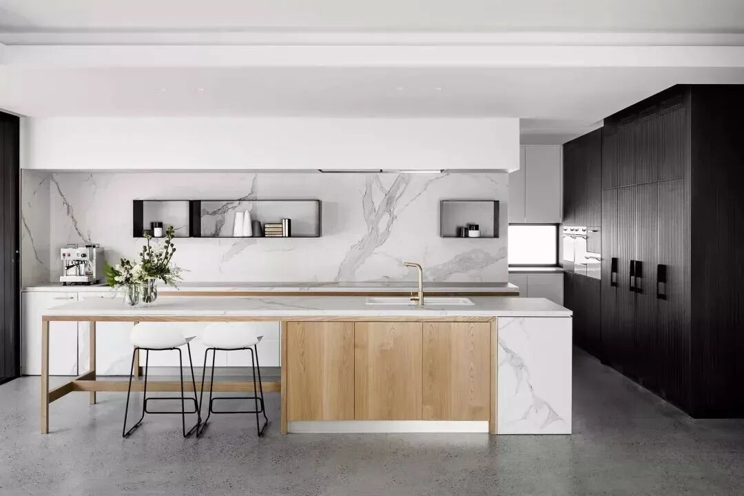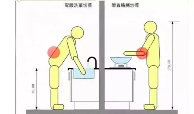 通常情況下,廚房爐灶區(qū)和水槽區(qū)是保持同一個高度,但這樣設(shè)計的話,那勢必在水槽區(qū)洗菜需要彎腰操作,而在爐灶區(qū)炒菜則要供著手臂,這樣做完一頓飯,也要累癱了。