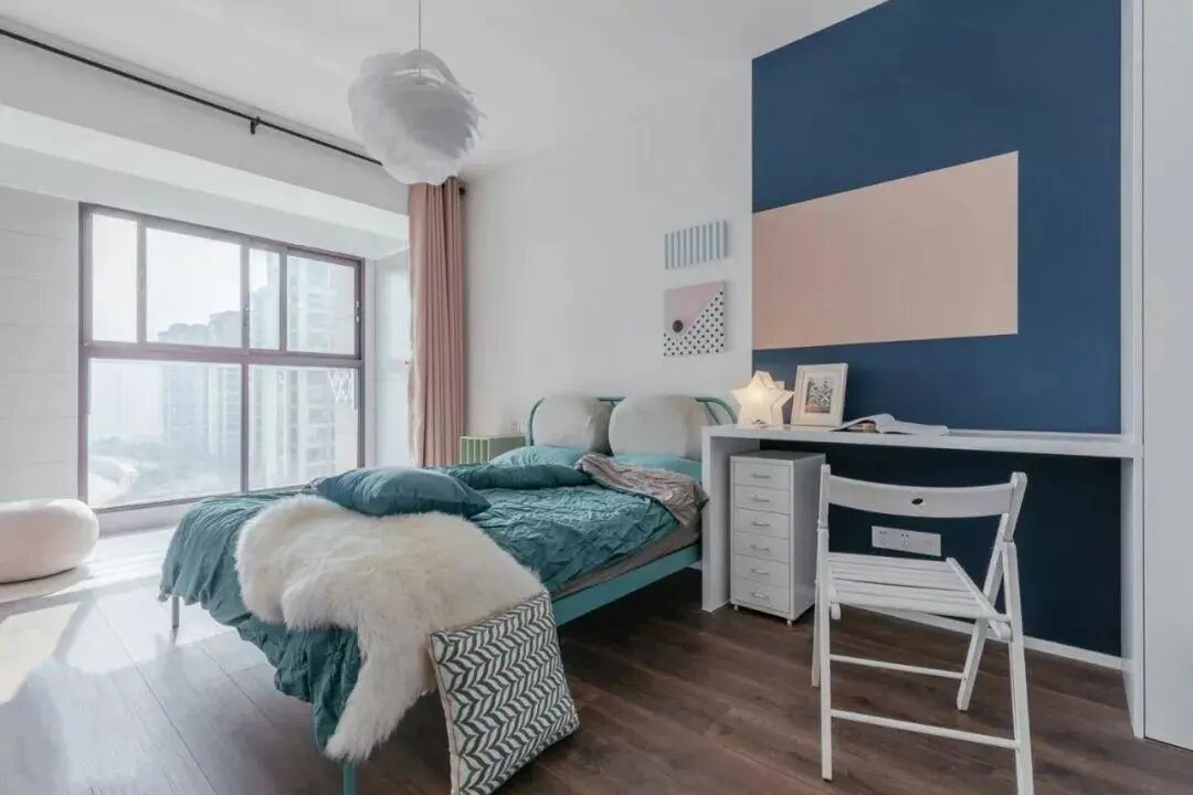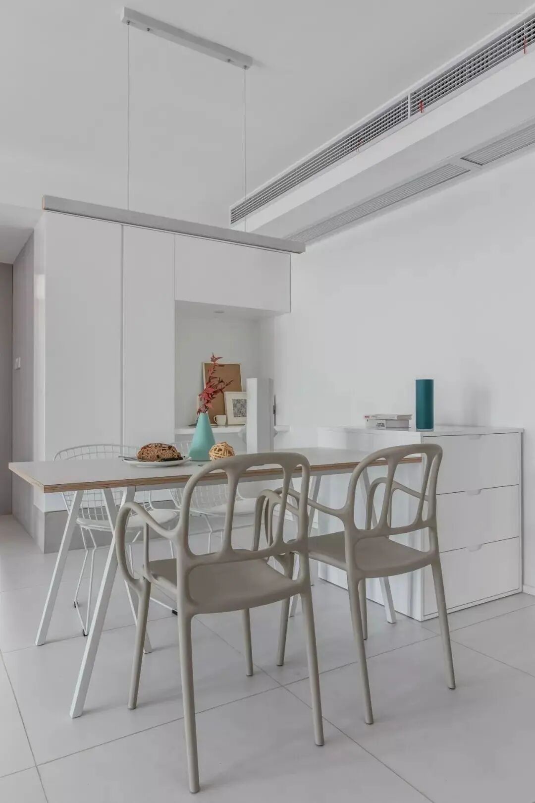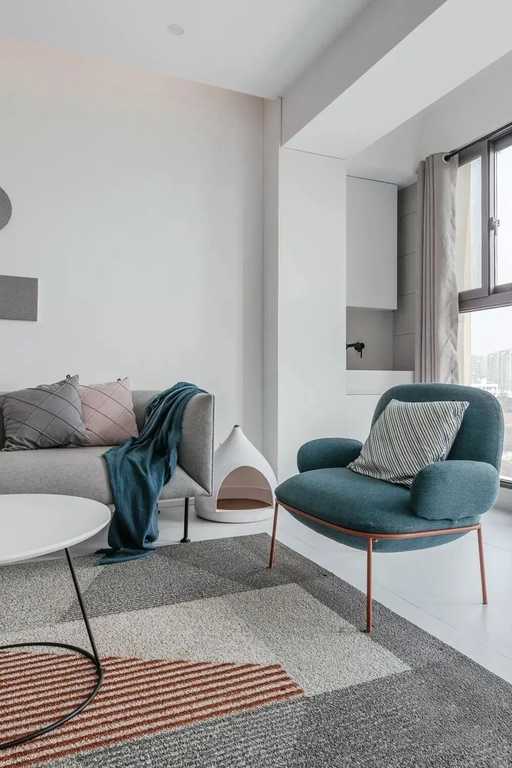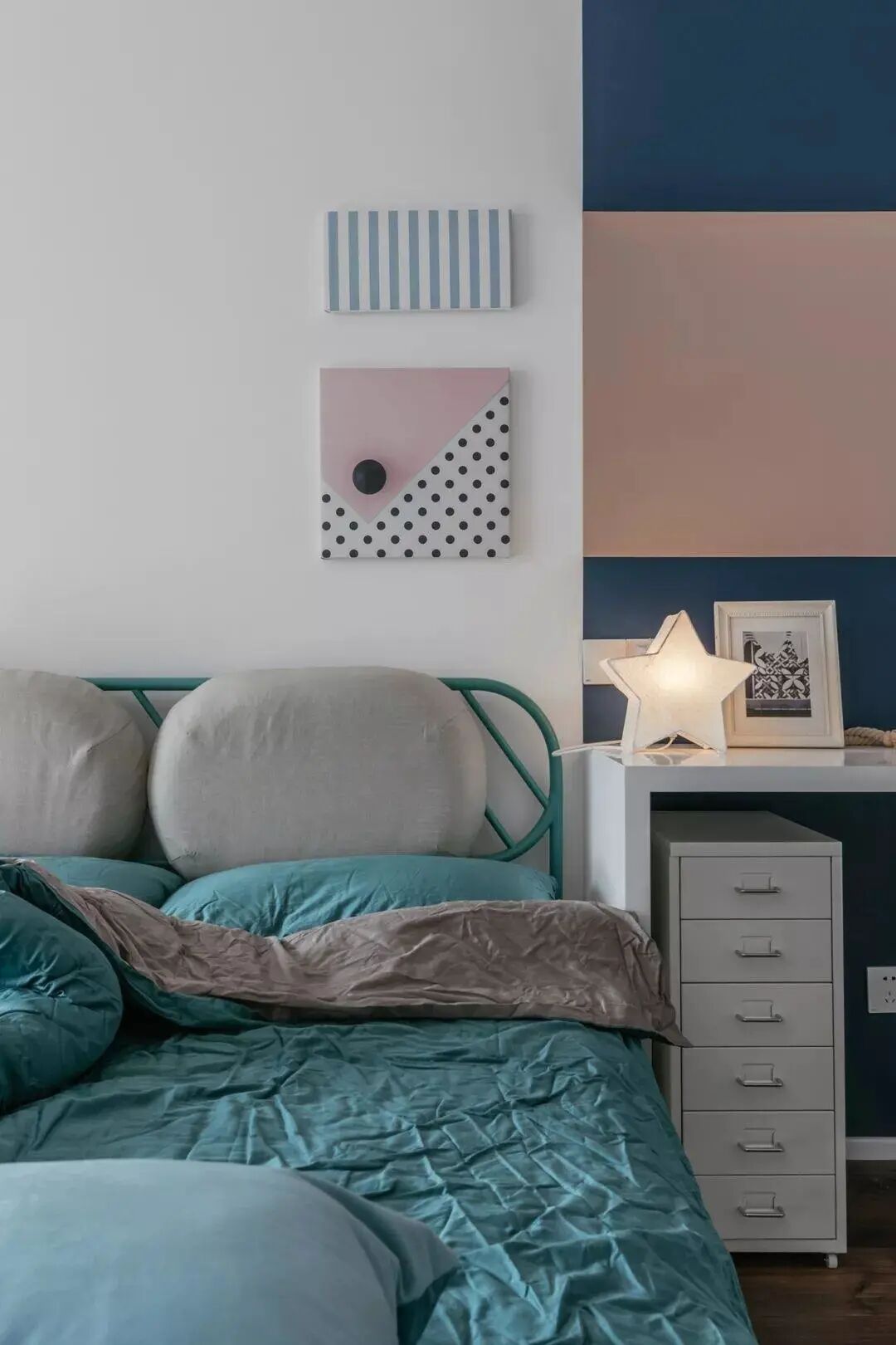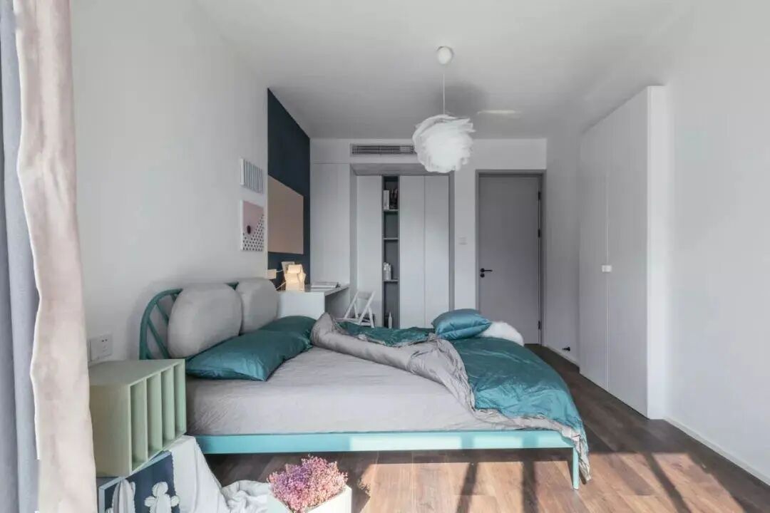 次臥相對(duì)整個(gè)極簡(jiǎn)空間來(lái)說(shuō)相對(duì)活潑,白色的空間內(nèi)運(yùn)用亮色系配飾作為點(diǎn)睛,清新綠、珊瑚粉、薄荷藍(lán),馬卡龍般甜美夢(mèng)幻,給予灰色調(diào)一種反差萌,卻也覺(jué)得極為妥帖。