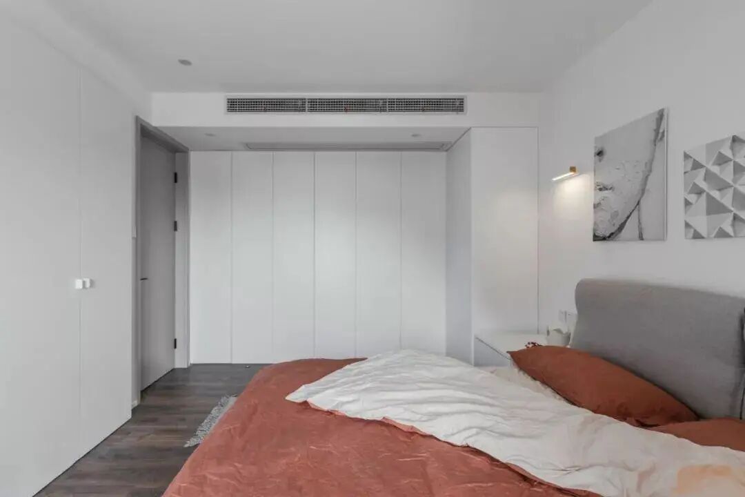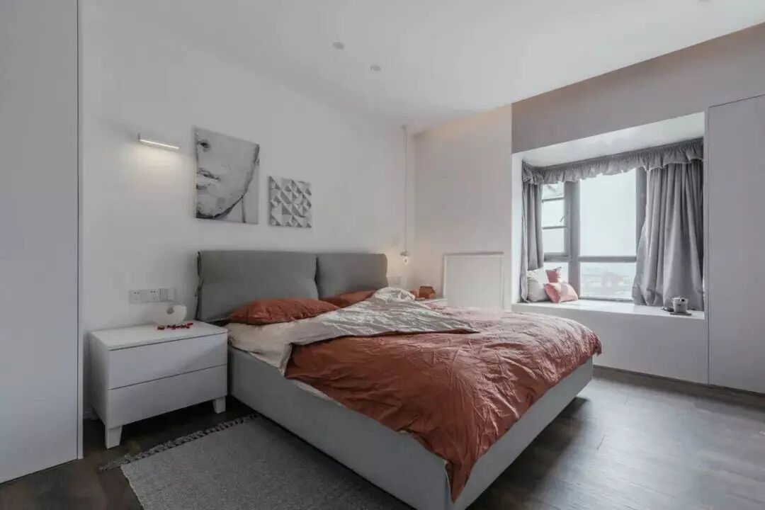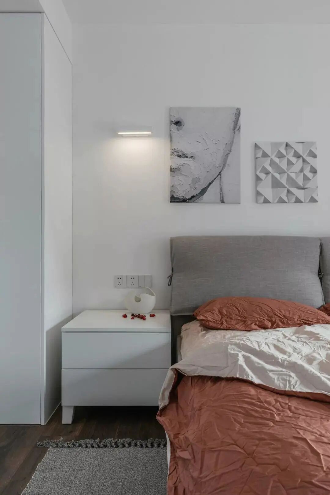 主臥依舊延續(xù)整個(gè)空間的風(fēng)格,在灰色度的空間關(guān)系中,加入橙色的床品進(jìn)行點(diǎn)綴,使得溫暖的色調(diào)和柔和的灰調(diào)相得益彰,一盞燈,一雙人,就是空間的靈魂。