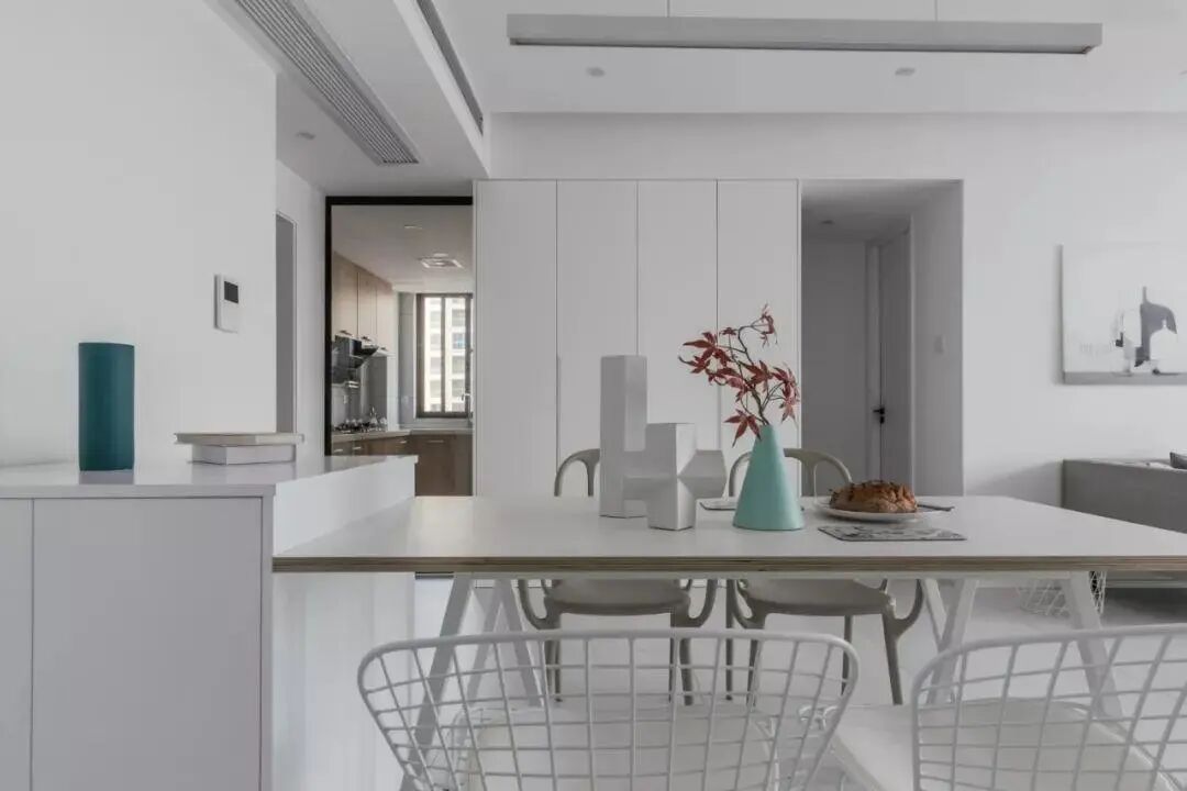 餐廳的桌椅在風(fēng)格上同樣沿用了灰色調(diào),看起來(lái)優(yōu)雅、內(nèi)斂,于一片靜謐中,營(yíng)造出溫馨舒適的用餐氛圍。上空的一字吊燈可是點(diǎn)睛之筆,賦予空間氣質(zhì)不俗的裝飾格調(diào)。