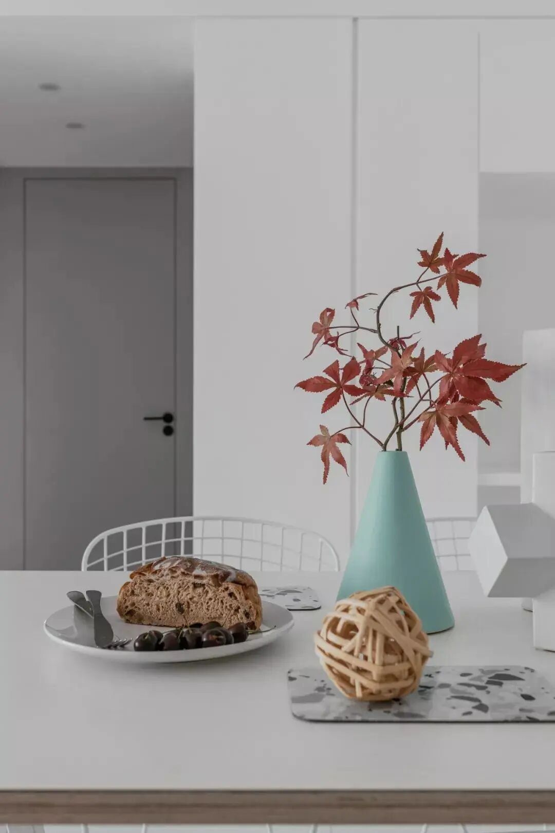薄荷藍(lán)的花瓶,紅色的楓葉,你可能一眼就被吸引到眼中來(lái),在灰色的空間關(guān)系中給了生機(jī),顯得不那么沉悶。干凈的線條、純粹的色彩,呈現(xiàn)出結(jié)構(gòu)本身雋永的美感,去除那些不必要的繁瑣設(shè)計(jì)和干擾,留下來(lái)的才是真正的高品質(zhì)生活空間。