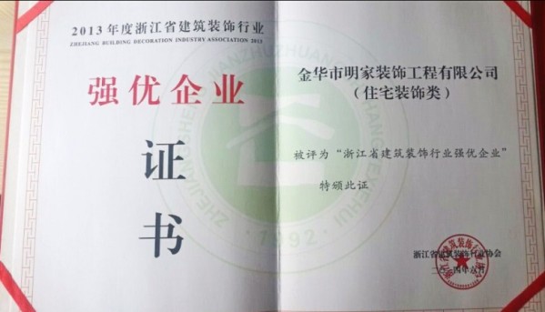 【強優(yōu)企業(yè)】歷來在省建筑裝飾行業(yè)中的評選是重中之重,住宅裝飾類只有8家企業(yè)入選,而金華只有1個名額。 2014年06月經(jīng)由浙江省建筑裝飾行業(yè)評選,金華明家裝飾工程有限公司榮獲2013年度浙江省建筑裝飾行業(yè)強優(yōu)企業(yè)